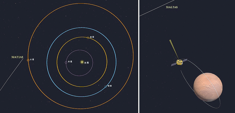 圖為星際天體阿特拉斯與天問一號火星環繞器相對位置示意圖(右圖是2025年10月3日相機拍攝時左圖的局部放大)。國家航天局提供
